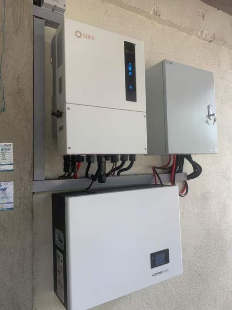A residential solar energy system integrates one Menred ESS LFP.6144.W unit, rated at 6.144kWh, paired directly with one SRNE hybrid inverter. This 1:1 configuration offers a minimal footprint solution suitable for homes with limited space or moderate daily energy needs.